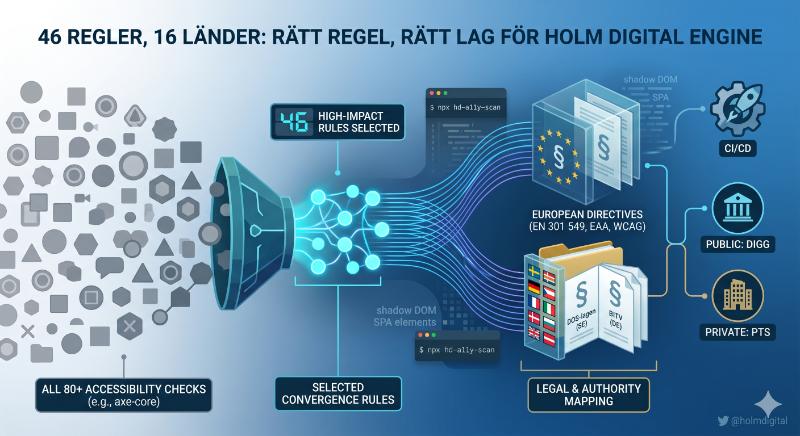Vi kallar dem konvergensregler. Det är reglerna där WCAG, EN 301 549 och den nationella lagstiftningen pekar på samma sak, med samma skärpa. Det är där den juridiska risken är konkret. Det är där vi lade vårt arbete.