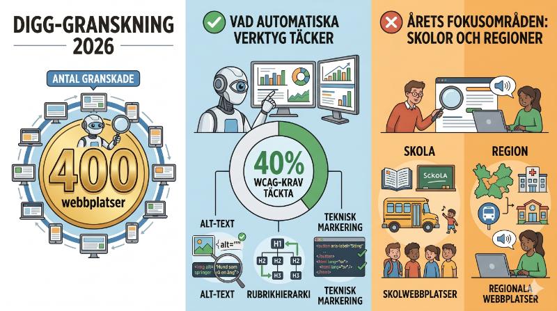 Den 27 april 2026 startade DIGG (Myndigheten för digital förvaltning) årets automatiska tillsyn av digital tillgänglighet. Cirka 400 svenska webbplatser granskas i omgången, och i fokus är skolor och regioner. Är er webbplats med? Och vet ni vad ni ska göra om DIGG knackar på?
